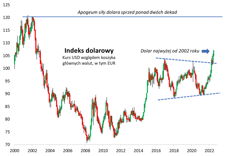 W centrum uwagi na przełomie półrocza znalazł się dolar amerykański, który już nie po raz pierwszy okazuje się głównym rozgrywającym w globalnych finansach. W mijającym tygodniu tzw. indeks dolarowy, pokazujący notowania USD względem koszyka innych głównych walut (z których największą wagę w koszyku ma euro), wspiął się na poziomy niewidziane od … dwóch dekad. Na wykresie pokazujemy, że doszło do wybicia górą z obszernej, kilkuletniej formacji trójkąta symetrycznego. Książkowy potencjał wynikający z tego sygnału powinien teoretycznie wystarczyć do wywindowania Dollar Index nawet w pobliże szczytów z 2000 roku.