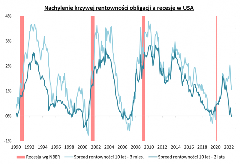 O tym, że koniunktura gospodarcza będzie się mocno schładzała, informuje kształt tzw. krzywej rentowności obligacji w USA. Historia podpowiada, że kiedy krzywa ulegała odwróceniu (inwersji), był to sygnał ostrzegawczy przed recesją. Odwrócenie polega na tym, że rentowności dłuższych obligacji skarbowych stają się niższe od rentowności krótszych papierów. Początek lipca przyniósł właśnie takie zjawisko na odcinku krzywej powyżej 1-2 lat. Przykładowo, klasyczny spread (różnica) rentowności papierów 10- i 2-letnich znalazł się w ostatnich dniach poniżej zera, co oznacza odwrócenie krzywej na tym odcinku. Narzekać można co prawda na niezbyt precyzyjny historyczny timing, jeśli chodzi o prognozowanie nadciągającej recesji przez odwróconą krzywą, niemniej można zakładać, że ciemne chmury gromadzą się nad gospodarkami po okresie covidowego przegrzania koniunktury.