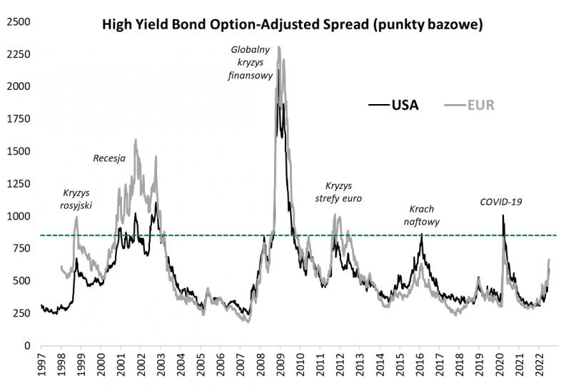 Wszystkie te zjawiska znajdują odzwierciedlenie w sytuacji na rynku obligacji korporacyjnych, w szczególności obserwowanych przez nas od lat papierów typu „high yield” (o wysokiej rentowności i ryzyku), które są najbardziej spokrewnione z rynkiem akcji. W ostatnich dniach spready w przypadku tych instrumentów (czyli nadwyżka rentowności nad obligacjami skarbowymi) zbliżyły się do 600 punktów bazowych w USA oraz 670 pb w strefie euro. Są to poziomy najwyższe od mniej więcej maja 2020. Czy to już koniec tej tendencji? Chyba niekoniecznie, skoro w sytuacjach typowo kryzysowych (ostre hamowanie gospodarek) spready rozszerzały się historycznie co najmniej powyżej 800 pb (czasem osiągały jeszcze duże wyższe wartości). Rozszerzanie się spreadów to klasyczna oznaka napięć w gospodarce i systemie finansowym. Z drugiej strony, gdy trend ten osiągnie punkt kulminacyjny, będzie to doskonała okazja do zakupów nie tylko ryzykownych obligacji, ale też spokrewnionych z nimi akcji (szczególnie gdyby towarzyszyła temu gołębia zmiana polityki Fedu).
