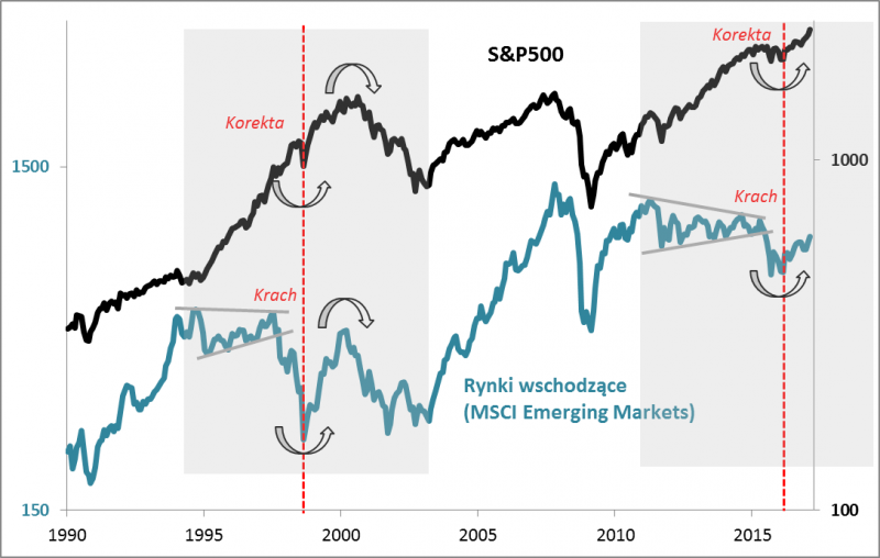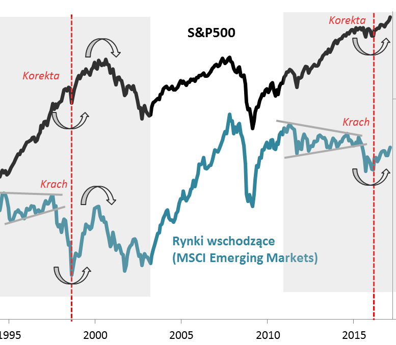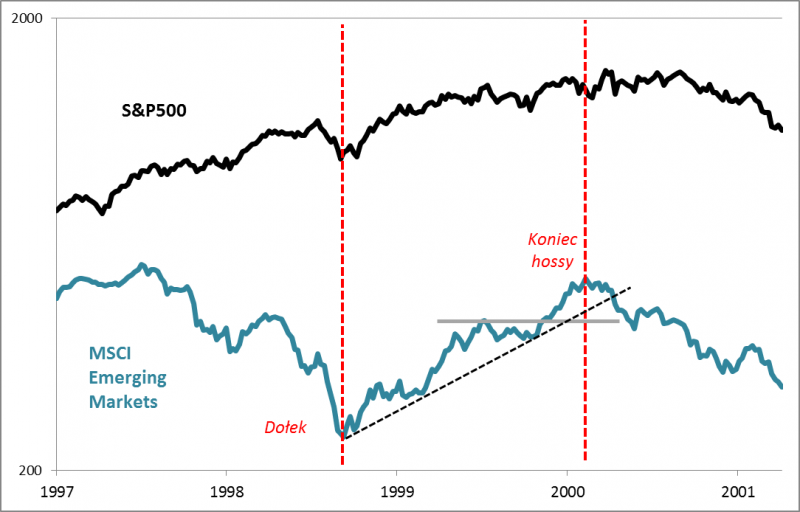 Po raz pierwszy opisywaną analogię dostrzegliśmy jeszcze wcześniej – w sierpniu 2015 roku, kiedy to w wyniku gwałtownej fali spadkowej indeks rynków wschodzących znalazł się na wieloletnich minimach (w jego ślady poszedł nasz WIG20), a jednocześnie amerykański S&P500 (oraz obejmujący go indeks rynków rozwiniętych) jedynie korygował się ze szczytów hossy i notował kilkunastomiesięczne minima. Poszukaliśmy wtedy podobnego historycznego przypadku (bessa na EM, korekta w USA). Okazało się, że jedynym takim przypadkiem w zasięgu wzroku była jesień 1998 r.