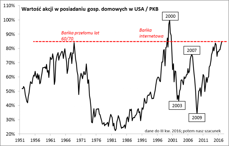 Od tamtego czasu sporo się oczywiście wydarzyło, więc czas zaktualizować rozważania. Zgodnie z całą tą koncepcją amerykański rynek akcji nie tylko powrócił do rekordowych poziomów, ale nawet sięgnął po nowe szczyty – ku zaskoczeniu wielu, którzy jeszcze niedawno byli przekonani o rychłej bessie. Przeszkodą nie okazują się póki co wysokie wyceny akcji w USA (ale tylko tam). Dokładnie tak samo było jednak pod koniec lat 90. – to, że akcje za oceanem były drogie, nie przeszkadzało im w dalszej wspinaczce (do czasu – na dłuższą metę skutki były opłakane). Jeden z naszych ulubionych barometrów (wartość akcji w posiadaniu inwestorów indywidualnych/PKB) sięga szacunkowo poziomu 85 proc., podczas gdy w szczycie bańki internetowej na przełomie 1999/2000 wynosił rekordowego pułapu ok. 100 proc. Dla porównania, hossa w 2009 r. startowała, gdy współczynnik ten wynosił zaledwie 34 proc.