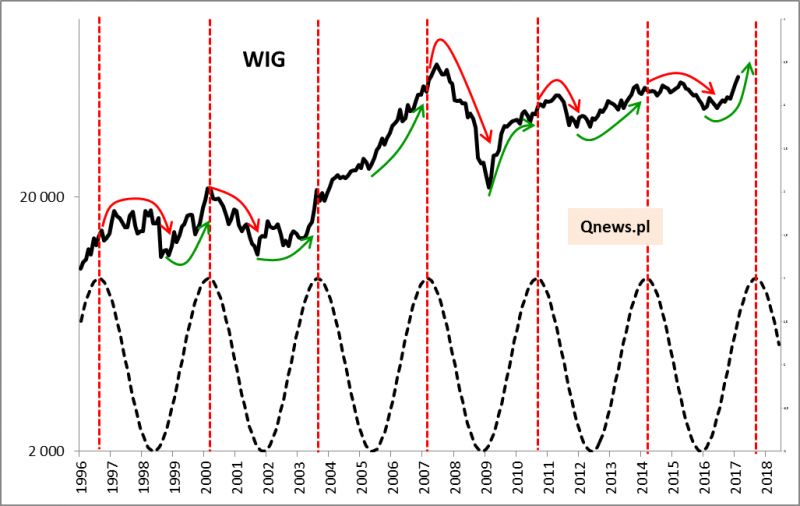 A skoro o GPW mowa, to szokujące wnioski z analogii ciekawie komponują się z monitorowanym przez nas charakterystycznym dla naszej giełdy cyklem ok. 40-miesięcznym. Teoretyczny szczyt tego cyklu wypada właśnie w okolicach sierpnia 2017! A warto pamiętać, że ten cykl to coś więcej, niż ciekawostka, bo na jego podstawie trafnie wysnuliśmy tezę o dołku koniunktury na przełomie 2015/2016.