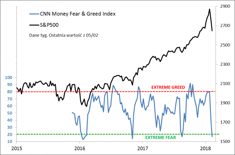 O krótkoterminowym wyprzedaniu - obok VIX-a - informuje także monitorowany przez nas wskaźnik "Fear & Greed". Do tej pory tak niskie jego poziomy były ... zachęcające, choć trzeba przyznać, że jego historia jest krótka i nie obejmuje najbardziej dramatycznych wydarzeń na rynkach.