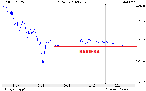 Cofnijmy się pamięcią o ponad trzy lata. Jest II połowa 2011 r. - turbulencje na rynkach finansowych i obawy przed rozpadem strefy euro skłaniają wielu inwestorów do poszukiwania bezpiecznej przystani. Jedną z nich jest szwajcarski frank. Popyt na tę walutę winduje jej notowania, a efektem ubocznym jest podkopywanie szwajcarskiego eksportu i spowolnienie gospodarcze. To nie podoba się Szwajcarskiemu Bankowi Centralnemu (SNB). We wrześniu 2011 r. wprowadza barierę dla franka (CHF) - kurs euro nie może spaść poniżej granicy 1,20 CHF. Aby wymusić respektowanie tej bariery, bank deklaruje, że jest "gotowy kupować euro w nieograniczonych ilościach" (w domyśle może dodrukować tyle franków ile tylko trzeba, by kupować euro).