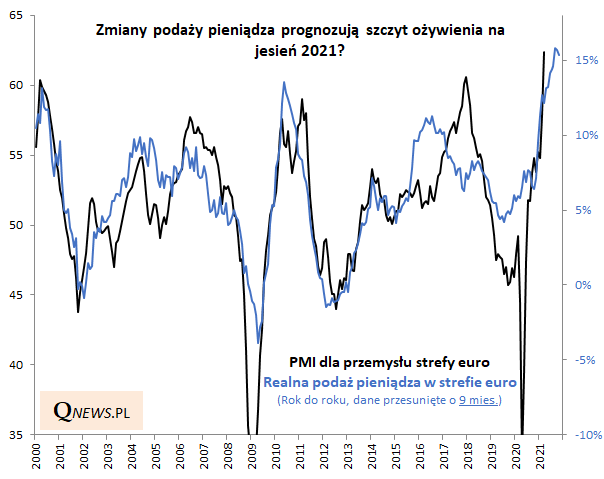 Jakiś czas temu analitycy J.P. Morgan zauważyli, że urealnione (czyli skorygowane o inflację) zmiany M1 (jeden z agregatów podaży pieniądza, stanowiący wg definicji EBC sumę gotówki w obiegu i depozytów overnight) zdają się z 9-miesięcznym wyprzedzeniem prognozować trendy europejskiego PMI (wskaźnika koniunktury w przemyśle).