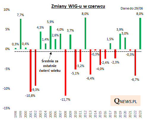 Tegoroczny nadspodziewanie dobry wynik oczywiście poprawia długoterminowe oblicze czerwca w statystykach, chociaż nie czyni z tego miesiąca statystycznego mistrza. Na przestrzeni ponad ćwierć wieku skumulowana zmiana WIG-u w czerwcu wynosi, nawet po tegorocznej miłej niespodziance, ... -11 proc.