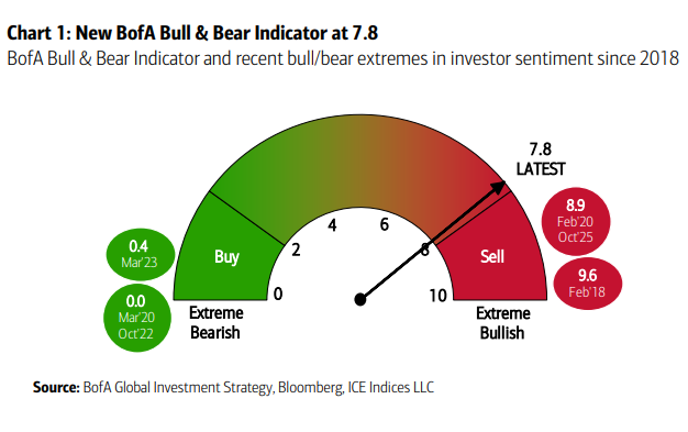 Przy okazji warto jeszcze dodać, że wyniki omawianego sondażu stanowią jeden z sześciu elementów branych pod uwagę przy tworzeniu innego narzędzia z arsenału analityków Bank of America - BofA Bull & Bear Indicator. Okazuje się, że wskaźnik jest na granicy strefy bardzo silnego optymizmu i o krok od technicznego sygnału sprzedaży ryzykownych aktywów (co ciekawe sygnał taki pojawił się już w październiku - od tego czasu korygują się kursy m.in. technologicznych gwiazd Wall Street).