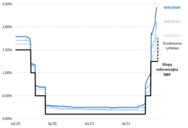 O ile ubiegły rok stał pod znakiem gwałtownego ścięcia stopy referencyjnej do niemal zera przez Radę Polityki Pieniężnej, to końcówka bieżącego roku odwróciła ten trend o 180 stopni. Sam fakt, że stopy rosną po raz pierwszy od ponad dziewięciu lat każe bacznie przyglądać się potencjalnym efektom tych decyzji. Tym bardziej, że wszystko wskazuje na to, że dotychczasowe dwie podwyżki to jeszcze nie koniec zacieśniania. Ekonomiści powszechnie spodziewają się kolejnej, trzeciej podwyżki na posiedzeniu 8 grudnia. Notowania kontraktów FRA implikują dalsze ruchy stopy referencyjnej w górę, aż do 3 proc. w połowie 2022 roku wobec 1,25 proc. po listopadowej podwyżce.