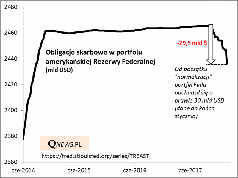 Załamanie strategii nastawionych na "łatwy zarobek" wraz z obniżaniem się zmienności ciekawie koresponduje z postępującą od grudnia zapaścią notowań bitcoina (z blisko 19 tys. dolarów do niemal 6 tys.). Zdaniem niektórych popularność spekulacyjnych pomysłów, takich jak XIV czy kryptowaluty, wynikała z połączenia dwóch czynników: utrzymywanej od lat skrajnie luźnej polityki banków centralnych oraz globalnego ożywienia gospodarczego. Trzeba jednak pamiętać, że obecnie banki centralne są już w trakcie stopniowego "przykręcania kurka z pieniędzmi". Liderem jest bez wątpienia amerykańska Rezerwa Federalna. W trakcie ostatniej fali euforycznych zwyżek na rynkach powszechnie przestano się przejmować faktem, że w USA postępuje przecież konsekwentnie "normalizacja" bilansu Fedu. Tymczasem ta operacja odwrotna do QE (czyli QT = quantitative tightening; zacieśnianie ilościowe) do końca stycznia odchudziła portfel obligacji skarbowych w posiadaniu banku centralnego o prawie 30 mld USD.