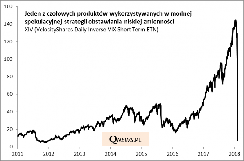 Bez wątpienia ostatnie dynamiczne wydarzenia na globalnych rynkach trwale zapiszą się na kartach historii - podobnie zresztą jak poprzedzający je okres wyjątkowej sielanki. Najbardziej namacalnym symptomem wiary w utrzymanie tej sielanki (czyli stabilnego wzrostu cen akcji przy jednoczesnym utrzymaniu bardzo niskiej zmienności) była rozkwitająca przez wiele miesięcy moda na spekulacyjne produkty zarabiające na utrzymaniu się wskaźnika VIX ("indeksu strachu") na skrajnie niskich poziomach. Wraz z nagłą eksplozją zmienności (we wtorek VIX zbliżył się do 50 pkt. - najwyżej od globalnego kryzysu finansowego z 2008 roku) te produkty również "eksplodowały". Flagowy instrument o symbolu XIV runął o ... ponad 90%, w wyniku czego zostanie automatycznie zamknięty. Wg niektórych szacunków w trakcie tego krachu "wyparowało" nawet kilka miliardów dolarów.