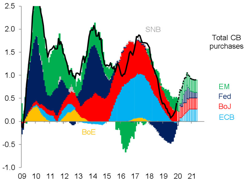 Źródło: Citi Research. Objaśnienia pojęć: Total CB purchases = całkowite zakupy obligacji przez główne banki centralne (QE).