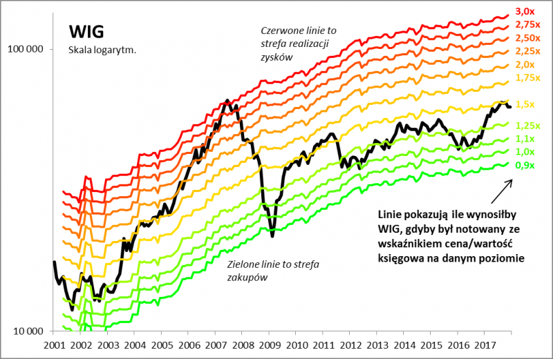 Oczywiście w krótszych okresach zmiany WIG-u potrafią być zupełnie oderwane od dość stabilnego wzrostu wartości księgowej, co pokazujemy na wykresie. Raz jest tak, że inwestorzy pod wpływem euforii potrafią wyceniać WIG np. na trzykrotność wartości bilansowej (patrz rok 2007), innym razem pod wpływem paniki wyceniają go … poniżej tej wartości (patrz dołek w 2009 roku). Obecna wycena jest mniej więcej gdzieś pośrodku historycznego przedziału wahań.