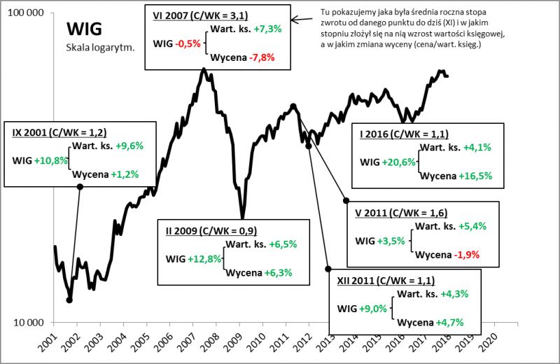 Ogólny morał z tego jest taki, że: (a) na dłuższą metę wartość spółek dość stabilnie rośnie, (b) aby maksymalnie dobrze skorzystać na tym wzroście należy kupować akcje przy jak najniższych poziomach wycen.
