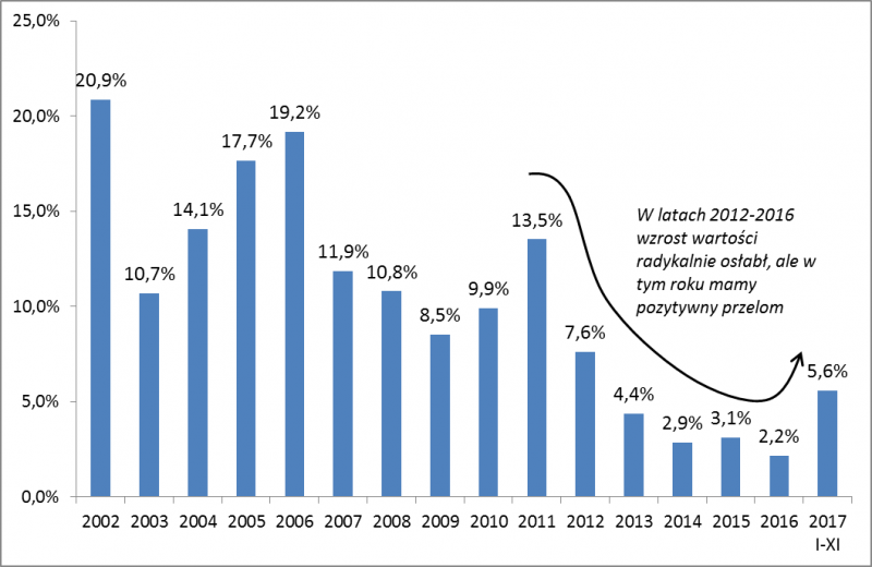 Jak przez pryzmat tych reguł wygląda obecna sytuacja? Zacznijmy od elementu bardziej stabilnego, czyli fundamentów. Na rys. 3 pokazujemy, że w pierwszych latach tego wieku tempo wzrostu wartości księgowej było dwucyfrowe, co miało związek zarówno z wysoką inflacją, jak i z szybszym tempem wzrostu PKB. Z kolei w ostatnich kilku latach tempo wzrostu wartości księgowej dramatycznie osłabło. Na szczęście w tym roku mamy pozytywny przełom. W okresie I-XI wartość księgowa powiększyła się wg naszych obliczeń o przyzwoite 5,6 proc.