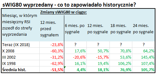 Reasumując, nie ma żadnej gwarancji, że trwający od wiosny 2017 roku trend spadkowy indeksu małych spółek dobiega końca. Historyczne porównania sugerują ryzyko kontynuacji tego trendu w kolejnych miesiącach. Ale nasze statystyki pokazują jednocześnie, że na dłuższą metę (w horyzoncie co najmniej półtorarocznym) stan technicznego wyprzedania, w jaki wchodzi sWIG80, był zawsze okazją do kupowania akcji małych spółek.