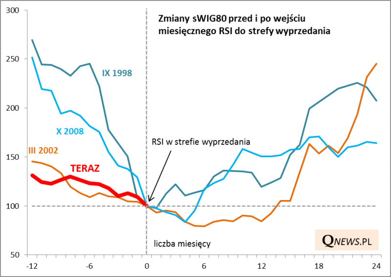 Weźmy pod lupę ścieżki indeksu "maluchów" po zejściu RSI do tej strefy. Historycznie taki sygnał pojawił się trzy razy: we wrześniu 1998, marcu 2002 i październiku 2008 (ciekawie komponuje się z tymi datami wrzesień br. - przypadek?).