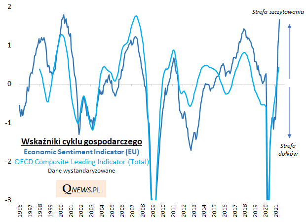 Z jednej strony pokazuje to jak dynamiczne jest wychodzenie gospodarek Europy z pandemicznej zapaści (kiedy to ESI był najniżej od globalnego kryzysu finansowego). A z drugiej każe się zastanawiać czy przypadkiem cykl ekonomiczny nie osiąga jakiejś lokalnej górki...