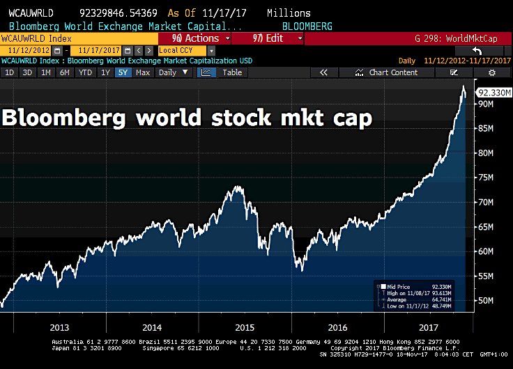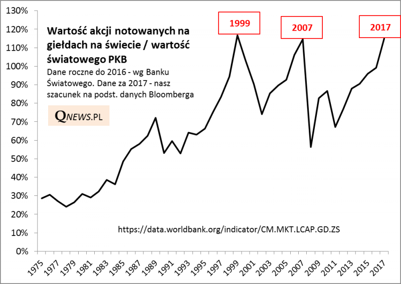 Ostatnie dostępne dane mówią o 75,5 bln USD w 2016 roku. Jeśli założymy bardzo orientacyjnie, że w tym roku globalne PKB urośnie do 80 bln USD, to widać, że globalna kapitalizacja giełdowa stanowi już co najmniej 115% światowej gospodarki.