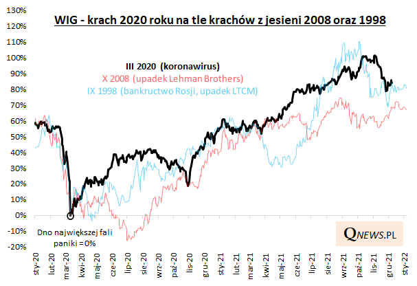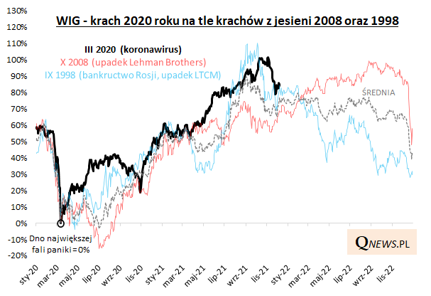W dramatycznych chwilach tuż po pandemicznym krachu w marcu 2020 zaprezentowaliśmy wykres zestawiający ówczesne zachowanie WIG-u z podobnymi pod względem dynamiki krachami z jesieni 2008 (upadek Lehman Brothers) i jesieni 1998 (krach na rynkach wschodzących po bankructwie Rosji). Podstawowy wniosek płynący z tego porównania był taki, że WIG ma szansę urosnąć o 50% do końca 2020 roku. Tamta projekcja sprawdziła się ... niemal perfekcyjnie, choć początkowo mogła wydawać się hurraoptymistyczna. Wykres odświeżyliśmy potem również pod kątem 2021 roku i wciąż pokazywał kierunek wzrostowy.