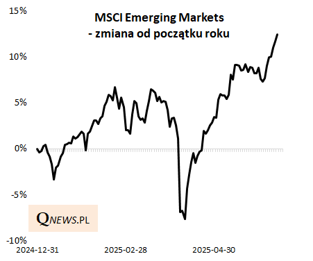 Naszą uwagę zwróciło w ostatnich dniach nadzwyczaj pozytywne zachowanie indeksu rynków wschodzących, który wspina się na nowe tegoroczne maksima i znalazł się już najwyżej od lutego 2022 (powrócił zatem powyżej punktu, w którym - w marcu 2022 - została z tego benchmarku wyrzucona Rosja).