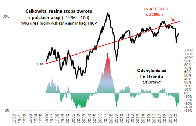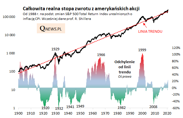 Na początku kwietnia, czyli w momencie gdy rynki ledwie zaczęły się podnosić po "korona-krachu", nawiązaliśmy do klasycznego dzieła prof. J. Siegela "Stocks for the Long Run". Autor wykazał w nim, że na przestrzeni dekad (a nawet wieków) realne stopy zwrotu z amerykańskich akcji oscylują wokół stale wznoszącej się linii trendu. Nasze obliczenia potwierdzają, że w długim okresie linia ta rośnie w tempie 6,7% w skali roku (jeszcze raz podkreślmy - w ujęciu realnym, czyli powyżej inflacji).