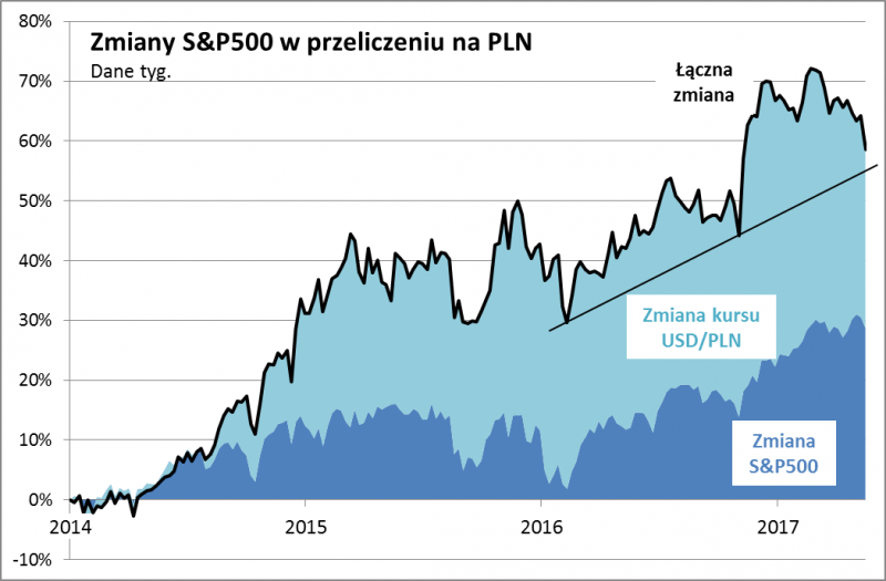 Na marginesie warto zauważyć, że z punktu widzenia polskich inwestorów zyski z amerykańskiego indeksu topnieją ostatnio dość szybko - nie tylko na skutek środowej korekty, ale też w efekcie ostatniego osłabienia dolara (wcześniej mechanizm ten działał w drugą stronę - umacnianie się USD powiększało stopy zwrotu).