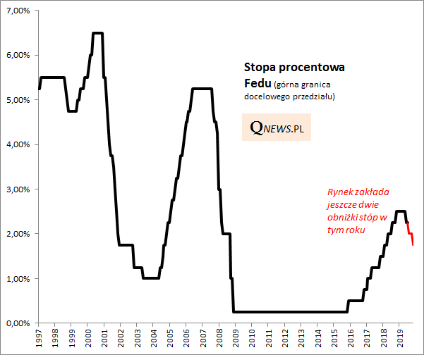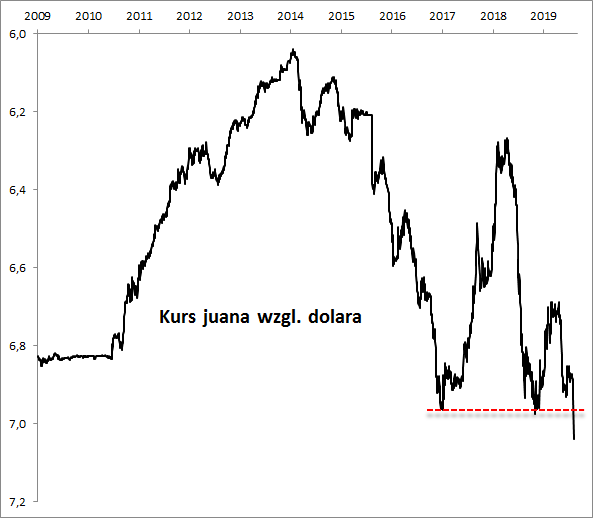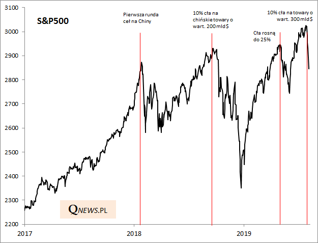 Coraz bardziej ewidentne staje się, że eskalacja wojen handlowych ma na celu "przy okazji" zmuszenie Fedu do obniżania stóp procentowych. Tweet o podwyżce ceł na chińskie produkty pojawił się dzień po posiedzeniu banku centralnego. Rynek oczekuje faktycznie serii kolejnych cięć stóp, mimo że szef Fedu J. Powell starał się studzić te oczekiwania.