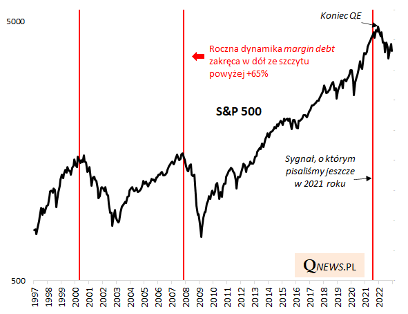 Przykładowo, w połowie 2021 roku pisaliśmy, że 12-miesięczna dynamika margin debt po osiągnięciu jednego z najwyższych poziomów w historii zaczyna zakręcać w dół. Z czasem okazał się to trafny sygnał nadejścia większego schłodzenia na Wall Street (w realizacji tego zagrożenia "pomógł" też Fed, wyłączając ultra luźną politykę monetarną).