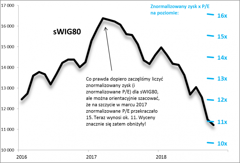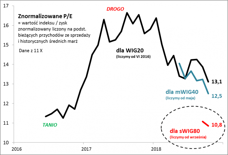 Jakie konkluzją płyną z tych wszystkich wyliczeń? Bezprecedensowa słabość sWIG80, trwająca od wielu miesięcy i w ostatnim czasie napędzana już przede wszystkim przez odpływy kapitału z niektórych funduszy, sprowadziła wyceny akcji do zdecydowanie niższych poziomów niż w przypadku pozostałych indeksów GPW. Wyceny – czy to liczone na podstawie naszej metodologii zysku znormalizowanego, czy też w oparciu o zyski prognozowane przez analityków na przyszły rok – są też niskie w ujęciu absolutnym (a nie tylko porównawczym). To teoretycznie oznacza znaczny potencjał na dłuższą metę, choć oczywiście nie przesądza jeszcze o niczym na krótką metę (zawsze może być jeszcze taniej).