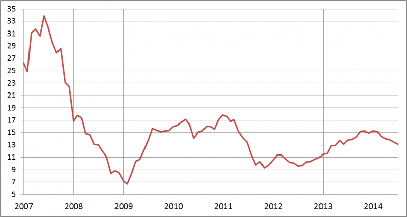 Pewnym problemem jest fakt, że w poszczególnych cyklach P/E ustanawia szczyty/dołki na innych poziomach. Sposobem na rozwiązanie tego problemu jest działanie stopniowe. Pomijając specyficzny okres lat 2006-2007, który można określić dziś jako bańkę spekulacyjną, na podstawie danych z lat 2008-2014 wyobrazić sobie taki przykładowy schemat ustalania udziału akcji w portfelu: