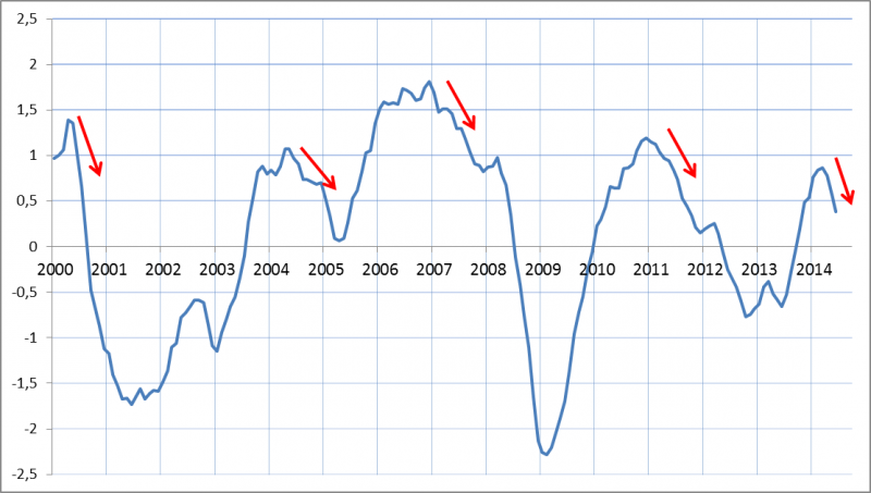 Cykl koniunkturalny zajmuje poczesne miejsce w analizach na Qnews. Jak zmierzyć cykl? Przykładowo za pomocą obliczanego przez nas Zagregowanego Indeksu Koniunktury zbudowanego z trzech wskaźników wyprzedzających (PMI + Pengab + Ifo).