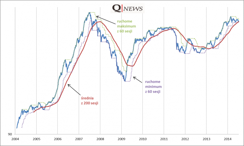 • redukuj udział akcji, gdy indeks nieważony wysyła sygnały załamywania się trendu wzrostowego (przykładowo spada do poziomu najniższego od 60 sesji i/lub przebija w dół 200-sesyjną średnią kroczącą).=