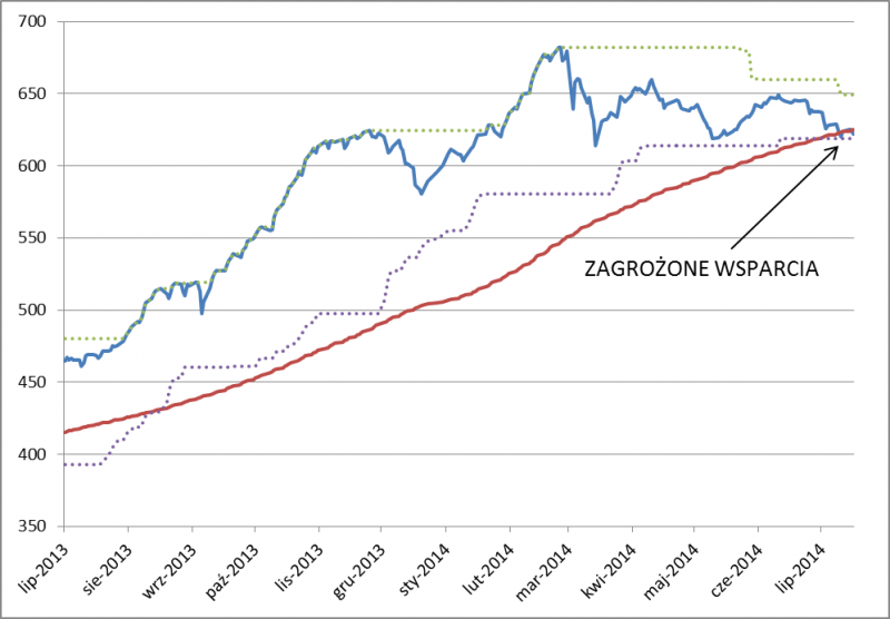 Obecnie indeks nieważony balansuje na poziomach wsparcia. Dla bezpieczeństwa zakładamy, że strategia startuje z zerowym udziałem akcji (to tylko kwestia punktu startu – gdyby strategia wystartowała np. rok temu, udział akcji pozostawałby na wysokim poziomie). Pokonanie poziomów oporu byłoby zachętą do zwiększania tego udziału.