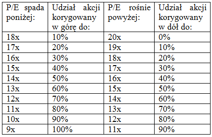Przykładowo, kiedy P/E spada poniżej 10x, udział akcji zwiększamy do 90%, natomiast kiedy potem zaczyna rosnąć i przekracza 12x, realizujemy część zysków i obniżamy udział akcji do 80%. Rzecz jasna jest to tylko przykładowy schemat.