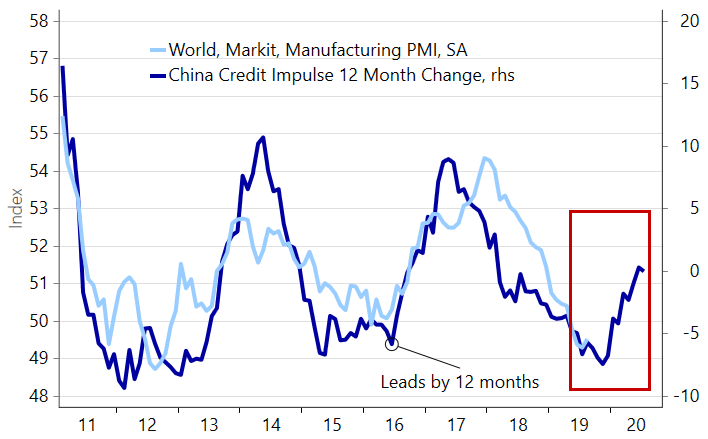 Skoro o bankach centralnych i polityce monetarnej mowa, to tym tropem poszli też analitycy Nordea Banku. Sugerują, że tzw. impuls kredytowy w Chinach z 12-miesięcznym wyprzedzeniem decyduje o globalnym PMI. Z tej korelacji wynikałoby, że punkt przełomowy w gospodarkach powinien mieć miejsce w okolicach przełomu roku.