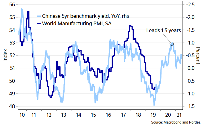 Ta sama Nordea w innym miejscu sugeruje również, że znaczenie mają wahania rentowności chińskich obligacji 5-letnich, które przekładają się na koniunkturę z aż półtorarocznym (!) wyprzedzeniem. Wg tej zależności poprawa powinna być nawet szybsza.