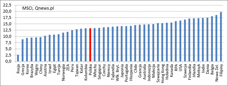 A co z Polską? P/E dla spółek z MSCI Poland jest w ostatnich miesiącach na stabilnym poziomie (13,3 na koniec stycznia). W rankingu sąsiadujemy z krajami takimi jak Włochy czy Kolumbia.