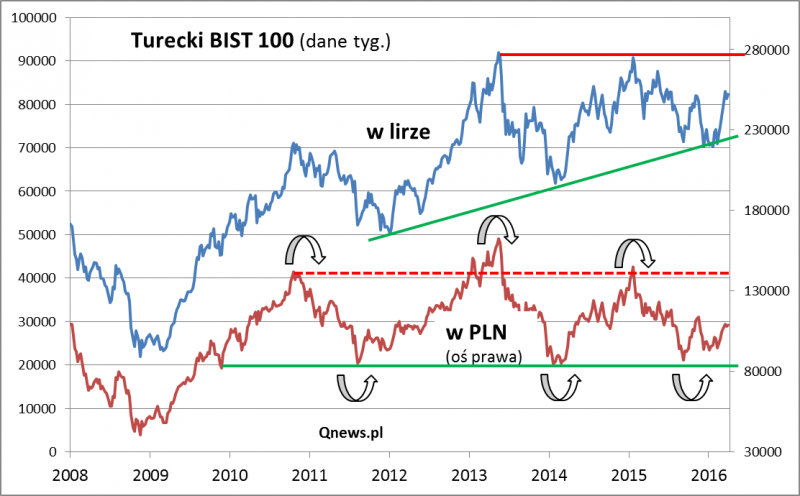 Bez względu na to czy spojrzymy na wykres indeksu BIST 100 w wersji oryginalnej, czy też po przeliczeniu jego wartości na PLN (to drugie podejście jest bardziej praktyczne dla polskich inwestorów - ryzyko kursowe jest bardzo istotne w przypadku Turcji), wniosek jest ten sam - do poziomów oporu umiejscowionych na szczytach z lat 2013-2015 (a w przypadku BIST 100 liczonego w PLN - także szczytu z 2010 r.) jest jeszcze dość sporo miejsca. Teoretycznie zatem cykl wzrostowy nie został jeszcze dopełniony. Diagnozy tej nie należy jednak nadinterpretować - nie jest równoznaczna z wizją nieprzerwanej i rychłej zwyżki ku szczytom.