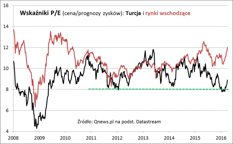 Pocieszające jest to, że mimo odreagowania wyceny akcji w Stambule nie podniosły się do niebotycznych poziomów. O ile w dołku trzeba było za nie płacić niespełna 8-krotność prognozowanych zysków spółek, to ostatnio jest to ciągle mniej niż 9-krotność. Dla porównania, w cyklicznych szczytach koniunktury wyceny osiągały średnio 11,5-krotność zysków. Jednocześnie tureckie walory są nadal wyceniane ze sporym dyskontem względem ogółu rynków wschodzących. To dyskonto nawet się ostatnio powiększało (P/E na emerging markets wynosi ok. 12,0).