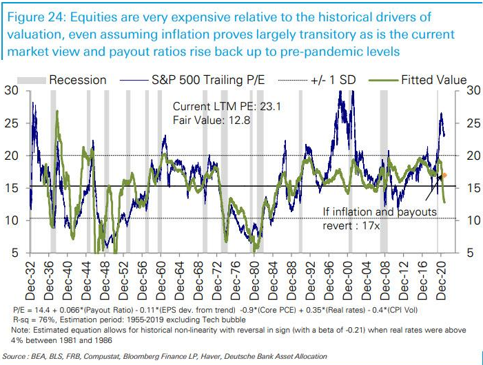 Chadha twierdzi jednocześnie, że tej drożyzny nie da się uzasadnić za pomocą czynników, które historycznie odpowiadały za poziom wycen. Wg modelu DB opartego na sześciu zmiennych (w tym m.in. realnych stopach procentowych) wskaźnik P/E grubo przekraczający 20x, teoretycznie powinien być w okolicy ... 12-13x.