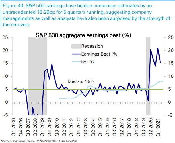 Co miałoby wywołać taką przecenę? Zdaniem Chadhy czynnikiem, który wywindował wskaźniki takie jak P/E były rekordowe pozytywne zaskoczenia jeśli chodzi o zyski spółek (earnings beats).