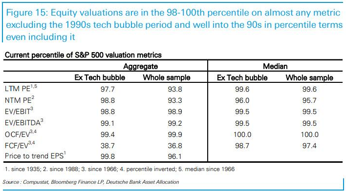 Punktem wyjścia do rozważań Chadha czyni fakt, że wyceny amerykańskich akcji są niezwykle wyśrubowane z historycznego punktu widzenia. Niemal wszystkie zestawione przez strategów DB wskaźniki wyceny są blisko górnej granicy historycznego przedziału.