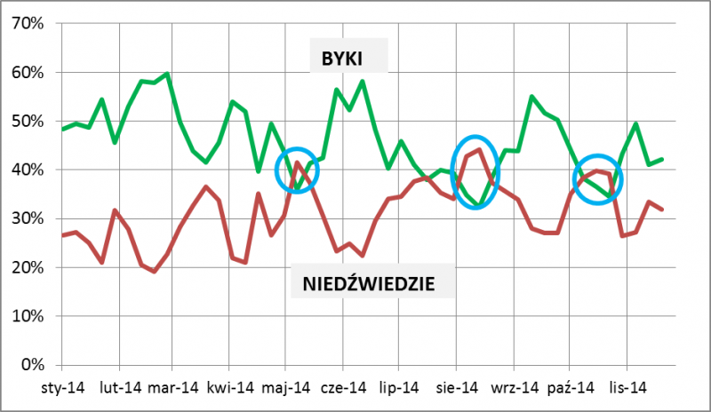 Zauważmy, że lokalne dołki WIG w sierpniu i październiku ustanowione zostały wówczas, gdy odsetek niedźwiedzi podskoczył powyżej odsetka byków. Z taką okazyjną sytuacją na razie jeszcze nie mamy do czynienia.