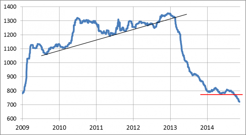 Jeśli jako wyznacznik trendu na rynku złota traktować zmiany zasobów kruszcu w portfelu największego funduszu ETF, to należy uznać, że trend jest ciągle spadkowy.