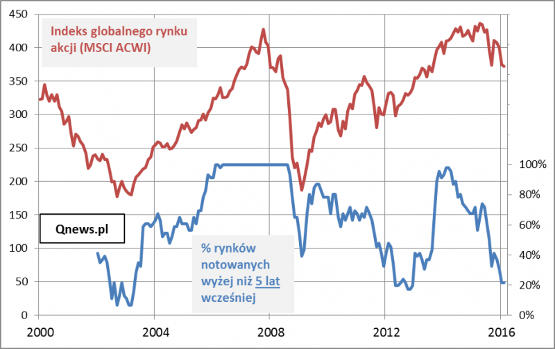 Zauważmy zaletę wskaźnika w tej wersji. Dwie poprzednie globalne bessy skończyły się (2002, 2009), gdy nasz wskaźnik spadł do ok. 4% (innymi słowy tylko 4% spośród kilkudziesięciu indeksów MSCI notowanych było wyżej niż 3 lata wcześniej). Takie punkty były perfekcyjnymi momentami do kupowania akcji.