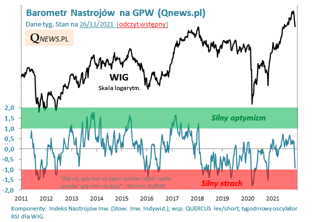 Nasz autorski Barometr Nastrojów na GPW według wstępnego odczytu aktualnego w chwili pisania tego artykułu (ostateczny za ten tydzień opublikujemy tutaj w poniedziałek rano) znalazł się już tylko o kroczek od strefy silnego strachu, gdzie historycznie na ogół opłacało się dokonywać większych zakupów akcji. Ale uwaga - ostateczny dołek wyprzedaży może pojawić się dopiero, gdy Barometr znajdzie się głęboko w owej strefie (tak było np. przed rokiem, w trakcie jesiennej wyprzedaży).