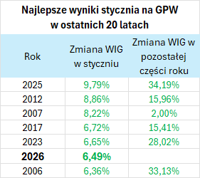 W tym roku mieliśmy na GPW solidny "efekt stycznia". Zwyżka WIG-u o 6,5 proc. co prawda nie dorównała fenomenalnemu wynikowi sprzed roku (9,8 proc.), ale - jak pokazuję w poniższej tabeli - i tak był to jeden z najlepszych wyników na przestrzeni ostatnich dwóch dekad (celowo nie wybiegam w tych statystykach w bardziej "zamierzchłą" przeszłość lat 90-tych, gdy indeks potrafił urosnąć nawet i po ponad 30 proc. - to były inne czasy).