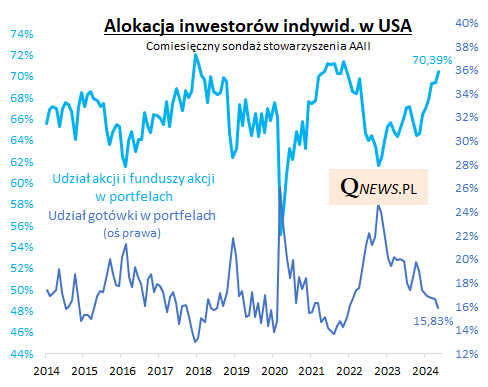Okazuje się, że sondażowy udział akcji (i funduszy akcji) wspiął się powyżej progu 70 proc. - po raz pierwszy od grudnia 2021. Z kolei, będący niejako odbiciem lustrzanym, udział gotówki w portfelach zmalał do 15,83 proc., również najniżej od końcówki 2021.