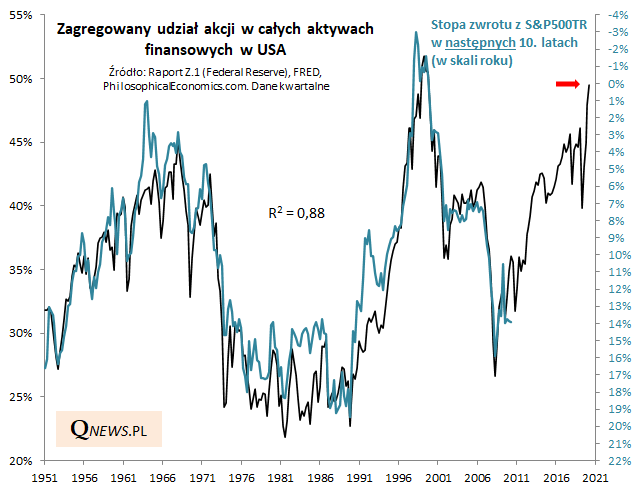 Na koniec I kwartału zagregowany udział akcji we wszystkich rynkowych aktywach finansowych w USA osiągnął poziom 49,5%. To wartość tak wysoka, że jeśli wierzyć historycznym zależnościom (a zależności te obejmują już prawie sześć dekad!), wieszcząca bardzo niskie (bliskie zera?) stopy zwrotu w kolejnych dziesięciu latach. Poprzednio (i tylko wtedy!) udział akcji w zagregowanym portfelu był tak wysoki na przestrzeni IV kwartału 1999 i wtedy zapowiadało to w zasadzie zerowe zyski w kolejnej dekadzie (i to z uwzględnieniem dywidend!).