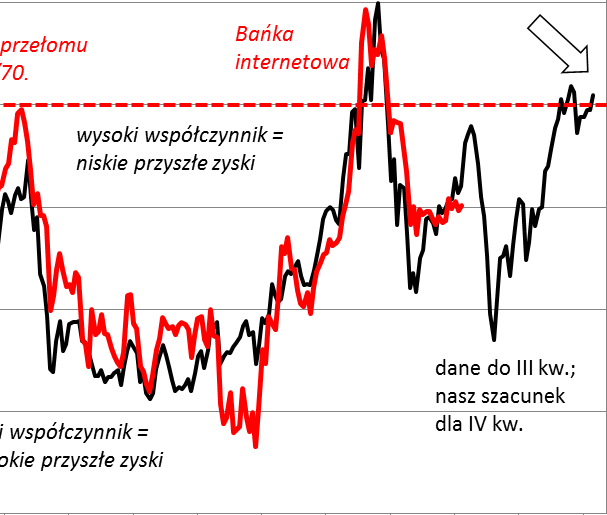Oczywiście ktoś może powiedzieć, że te prognozy dotyczą bardzo długiego okresu inwestycyjnego, a na krótką metę akcje mogą nadal drożeć. Faktycznie takiego scenariusza nie da się wykluczyć, bo przecież w najbardziej ekstremalnym momencie (szczyt bańki internetowej) omawiany współczynnik sięgnął aż 100% PKB. Nie oznaczało to wszakże, że model nie zadziałał - przez kolejne 10 lat S&P500 spadał o ok. 3% w skali roku.